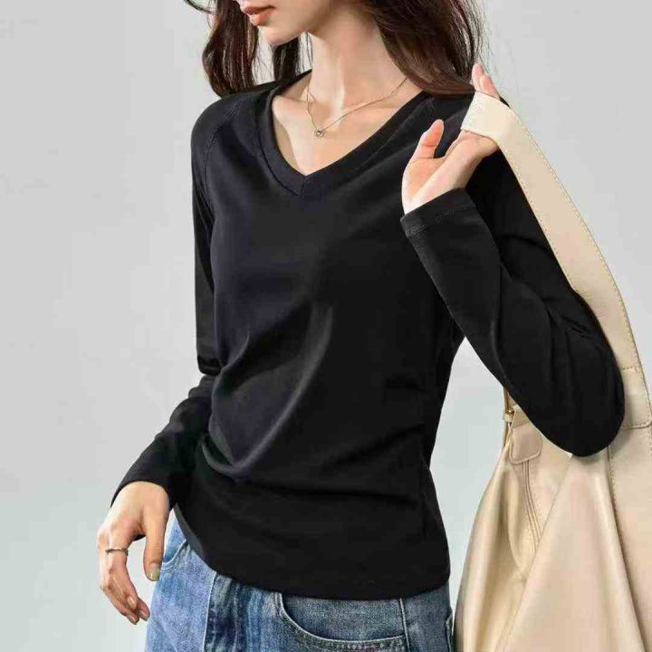 春季新款纯色V领/圆领长袖打底衫T恤女时尚简约褶皱收腰设计感上衣 ,数量 6...