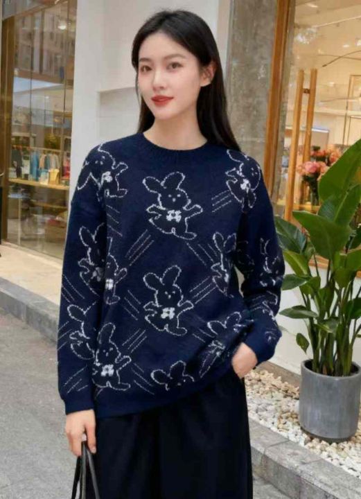 秋冬新款宽松慵懒风百搭卡通提花包芯纱加厚圆领套头毛衣,独立包装,均码面...