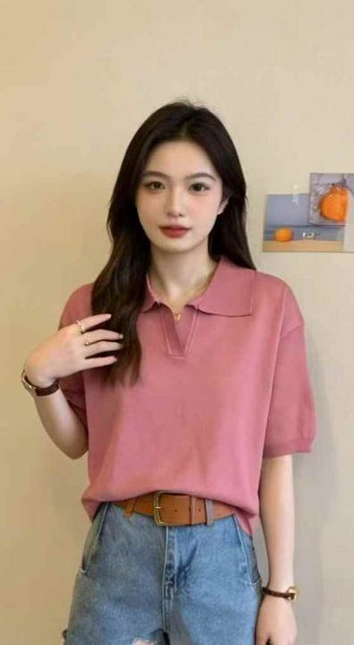 夏季薄款温柔风百搭翻领韩系宽松净版百搭短袖针织衫,独立包装,均码面料柔...