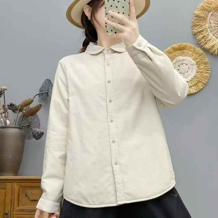 日系简约舒适加厚婴儿绒质感通勤减龄元宝领子母扣保暖长袖衬衫,面布纯棉质...