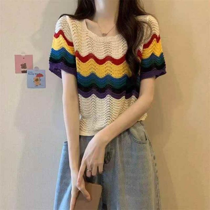 夏季新款彩虹条纹镂空冰丝宽松洋气减龄短款短袖针织小衫,独立包装,均码面...