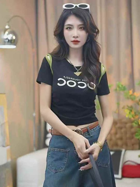 全清价5.9港风时髦露肩短袖t恤显瘦短款字母印花修身辣妹上衣,独立包装,1-...