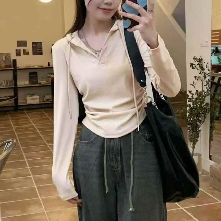 全清价6.9连帽卫衣修身显瘦正肩T恤小众气质长袖收腰上衣,独立包装,码数M-...