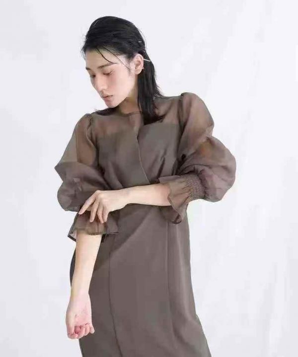 150条左右日单圆领拼接网纱微透喇叭袖收腰显瘦纯色开衩鱼尾连衣裙,质量超...