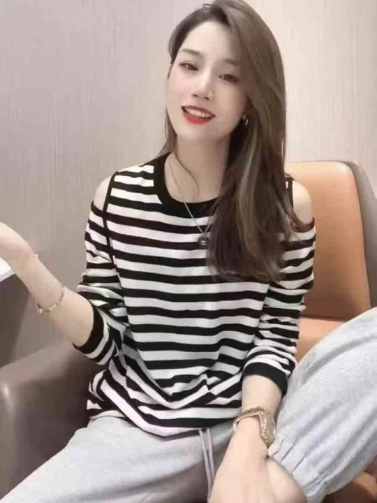 全清10.9,2025秋冬季新款割袖镂空露肩条纹长袖针织衫上衣女内搭...