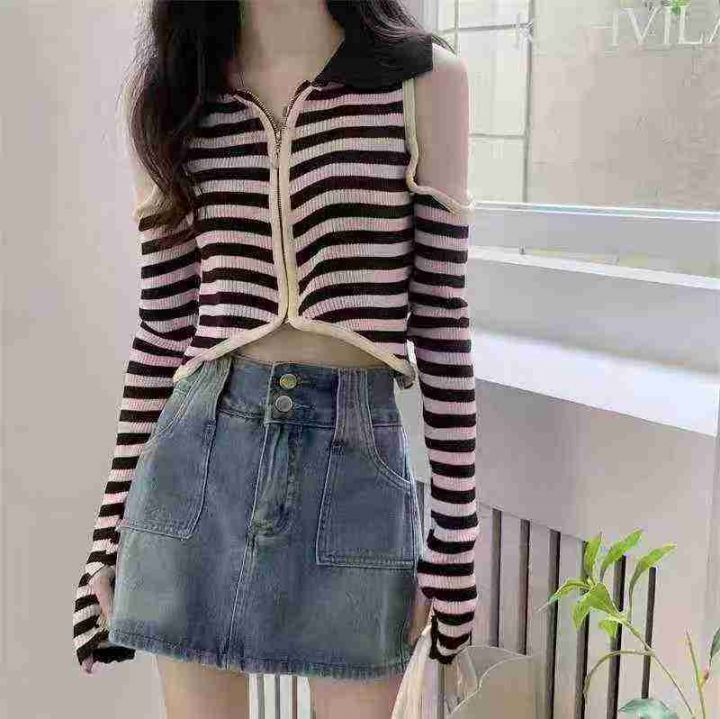 性感露肩条纹针织衫春秋高腰修身显瘦时尚翻领拉链开衫上衣,独立包装,均码...