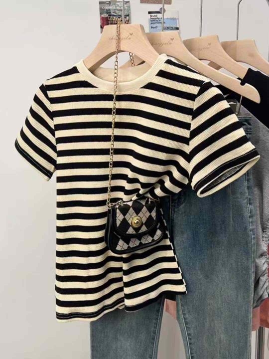 夏季新款撞色条纹针织短袖T桖,独立包装,均码面料柔软舒适弹力大,258件,...