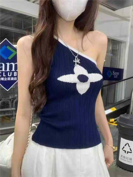 夏季新款高级感性感辣妹纯欲风无袖斜肩撞色针织小衫,独立包装,均码面料柔...