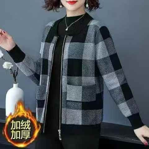 妈妈装圆领拉链夹克开衫春秋款,百搭格子款外套,加绒/不加绒各一半左右,...