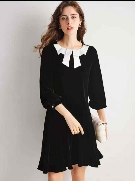 5.5元[爱心][爱心] 赫本风黑色金丝绒长袖连衣裙,独立包装,白色衣领串色...