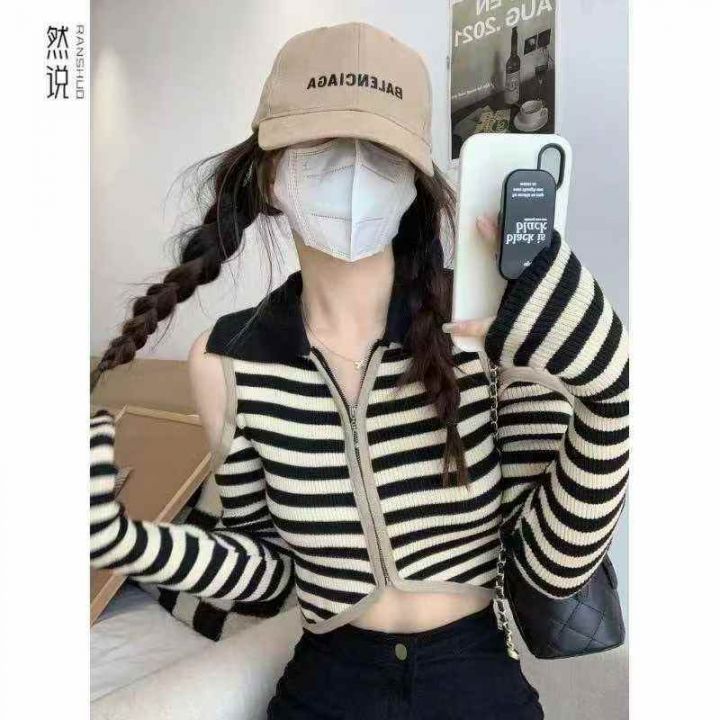 春秋新款性感辣妹纯欲撞色条纹POLO领露肩针织拉链开衫,独立包装,均码面料...
