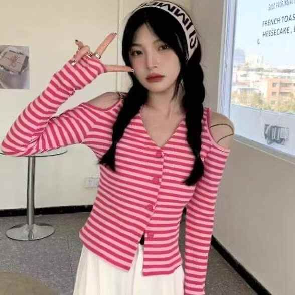 春夏季新款纯欲风V领露肩小心机设计感条纹显瘦针织开衫,独立包装,均码面...