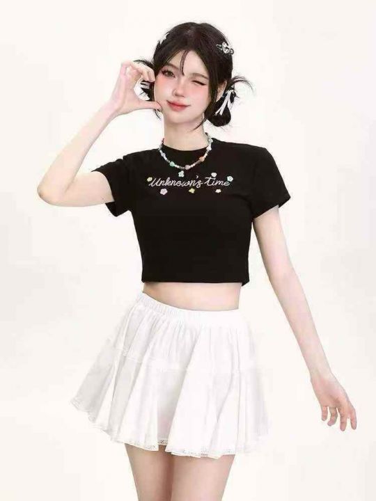 露脐上衣女高腰紧身设计感辣妹夏纯棉短款t恤甜辣妹正肩体恤上衣,韩标,独...
