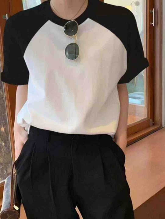 11元30件起批气质拼接上衣罗纹冰丝感黑白撞色插肩短袖t恤女新款夏短袖...