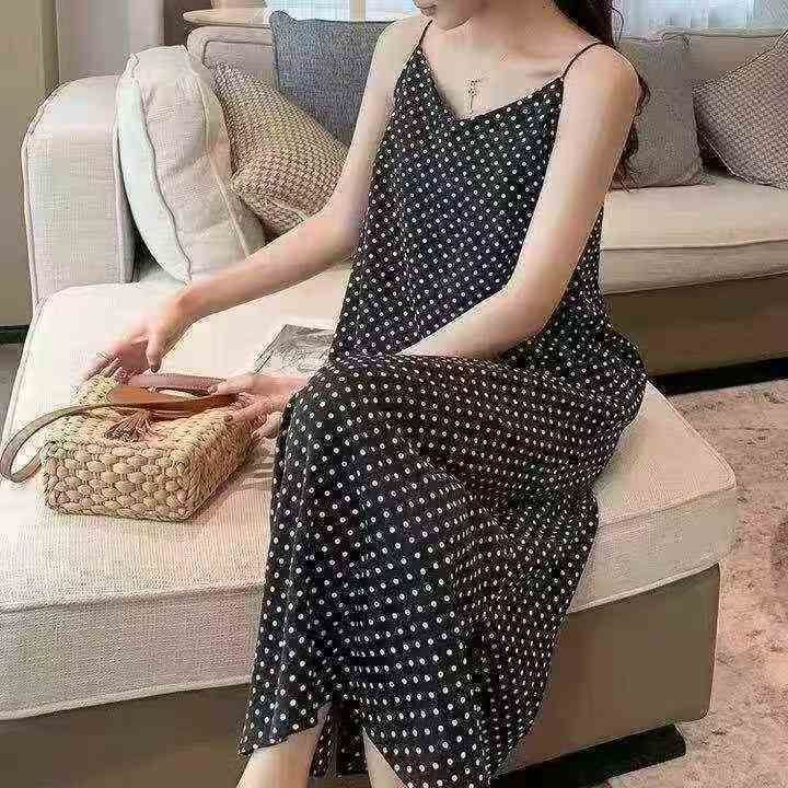 夏季新款高级感黑色波点连衣裙女宽松显瘦无袖气质法式长裙,整款单色,M-L....