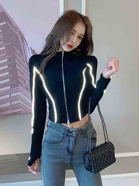 8.9清245件女装长袖T恤瑜伽服春秋季新款反光设计感双拉链设计感短款长袖上...
