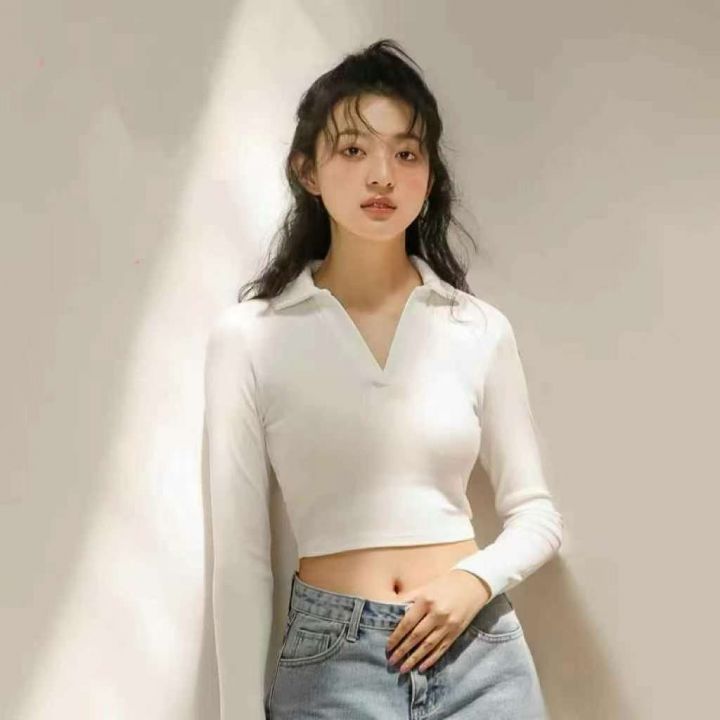 1200件美式复古辣妹polo领显瘦露脐紧身长袖T恤,尺码xs-XL ,面料软糯,四...
