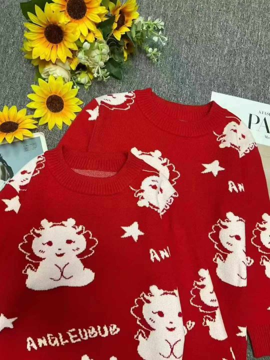 秋冬新款男女童中大童童装复古本命年红色提花包芯纱圆领套头毛衣,独立包装...