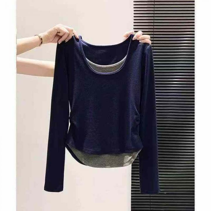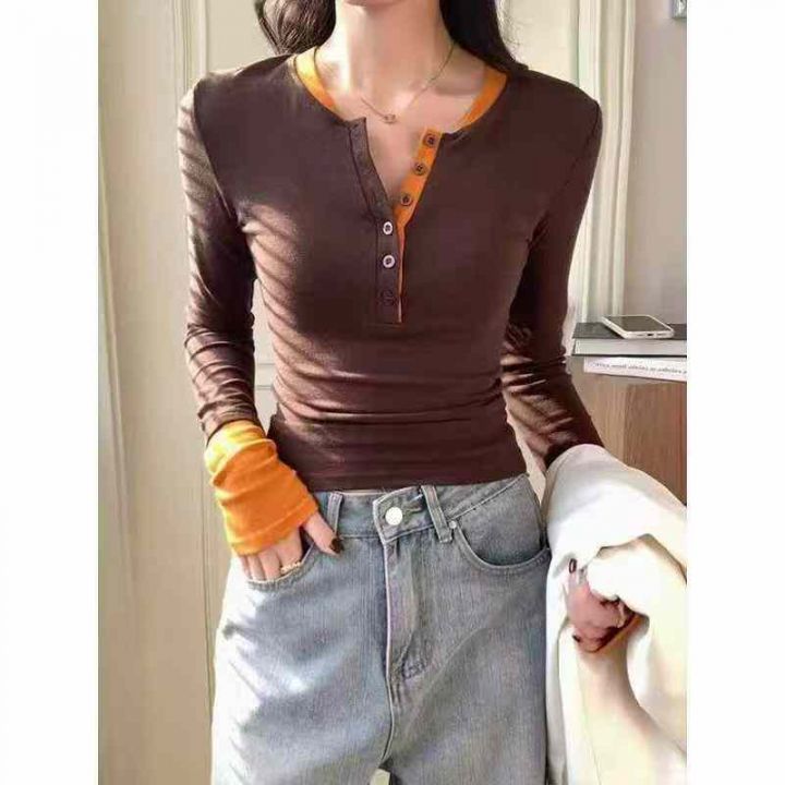 [太阳]1392件\'珊美式甜辣妹韩版假两件长袖t恤女春夏修身打底衫撞色纯欲显...