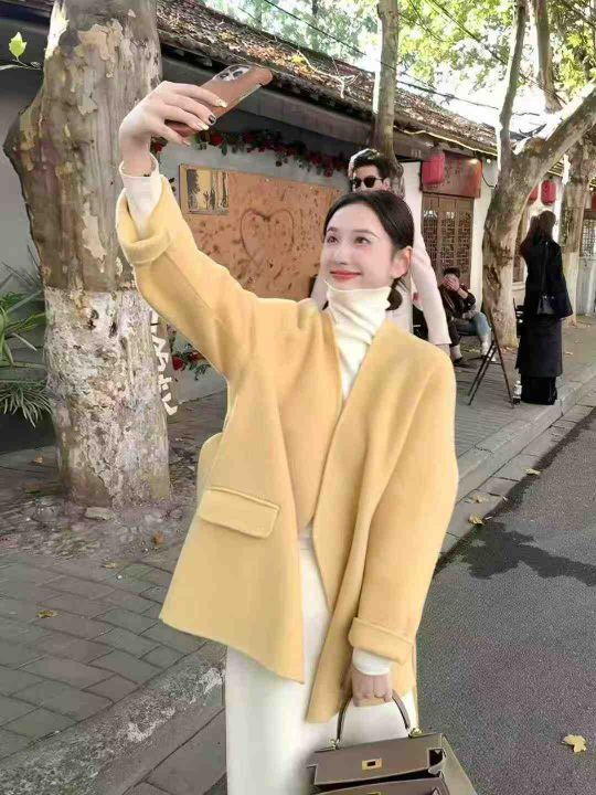 60件韩版气质绑带收腰开衫毛呢外套大衣女新款秋冬季高端宽松上衣,码数S—X...