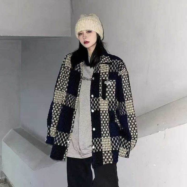 复古撞色编织格子外套271件,清19.8,宽松版情侣款,品质可,翻领设计,字...