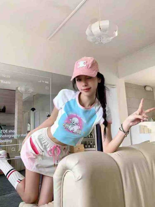 ☕️纯棉辣妹T多巴胺撞色插肩袖减龄卡通印花短款短袖圆领T恤女100件全清7.8...