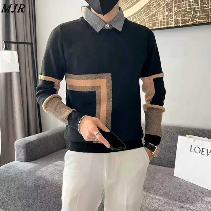 男装假两件毛衣男士长袖加厚韩版衬衫领拼接针织打底衫 205件全清12.8元,分...