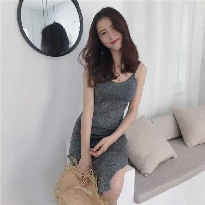 夏季新款弹力修身显瘦开叉设计款法式毛衣吊带针织连衣裙,独立包装,均码面...
