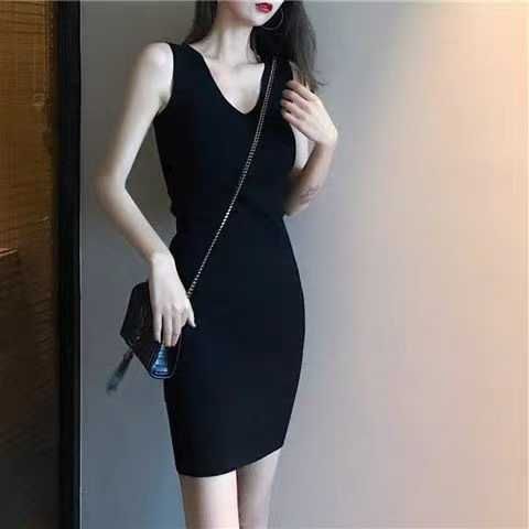 早秋新款法式纯欲性感辣妹弹力修身包臀黑色背心吊带针织连衣裙,独立包装,...