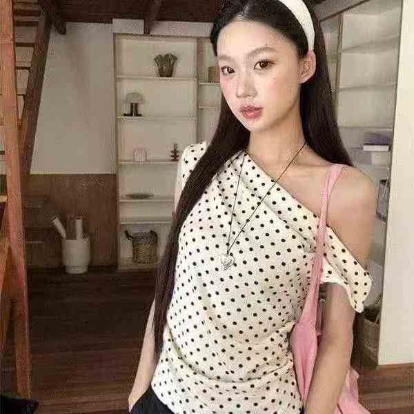 上新全清:7.8一件复古甜美波点斜肩修身辣妹上衣,[爱心]95件左右,蓝色为...