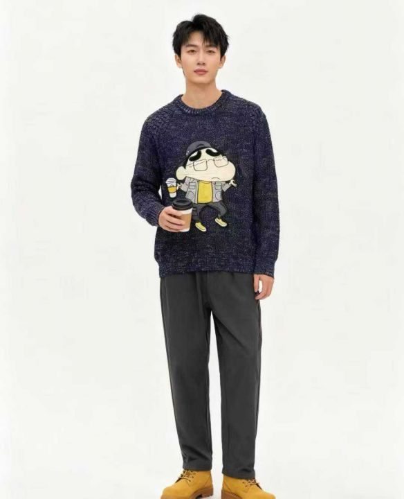 秋冬新款男女同款网红爆款卡通慵懒风蜡笔小新特种沙圆领套头毛衣,独立包装...