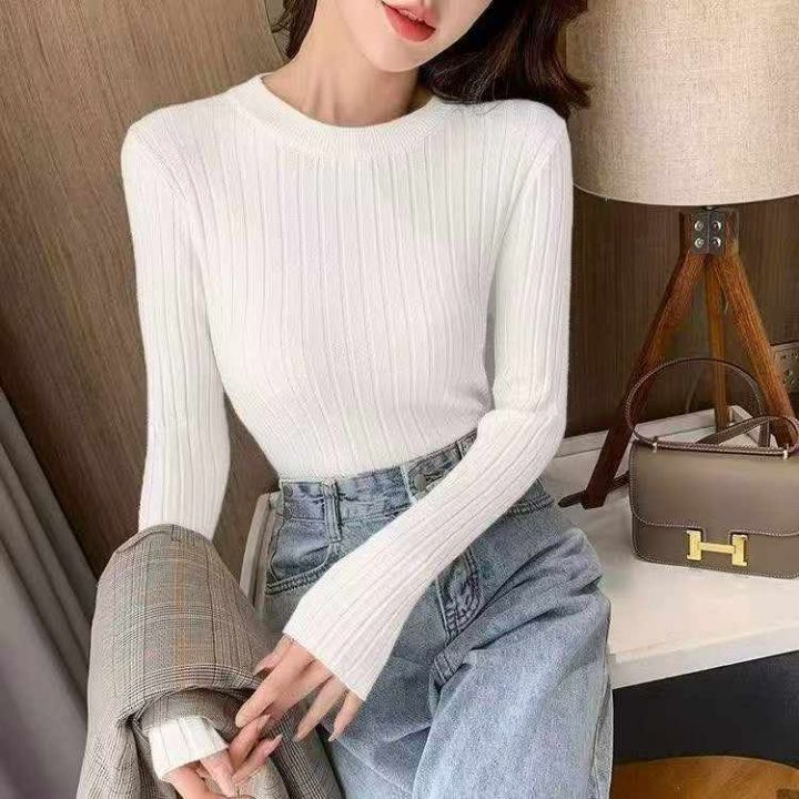 秋冬新款韩系净版弹力修身显瘦圆领坑条包芯纱套头毛衣,独立包装,均码面料...