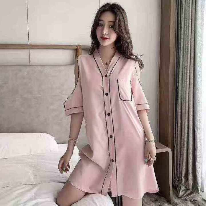 ① 网红冰丝性感露肩韩版宽松家居睡裙!独立包装,整款五色,有部分长袖款...