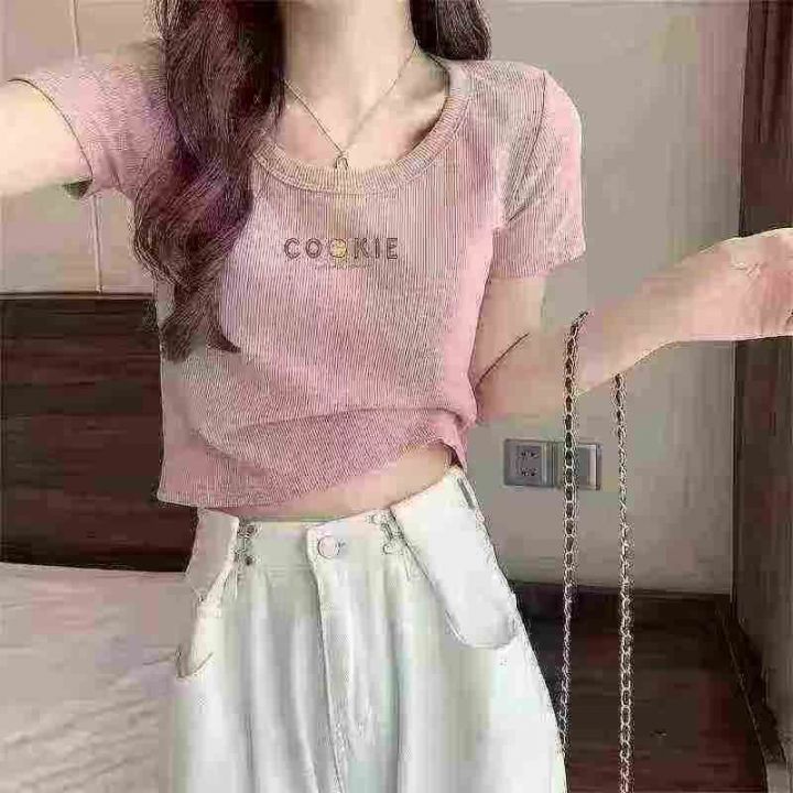 时尚洋气修身显瘦短款辣妹印花短袖T恤,图片款,品质好,工厂原单,5件一包...