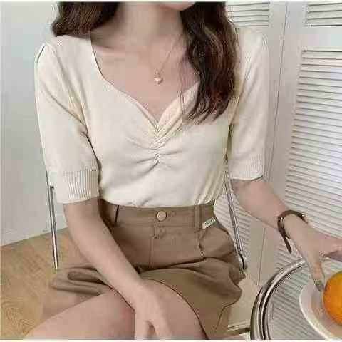 夏季新款温柔风宽松百搭冰丝复古V领针织T桖,独立包装均码面料软糯舒适弹力...