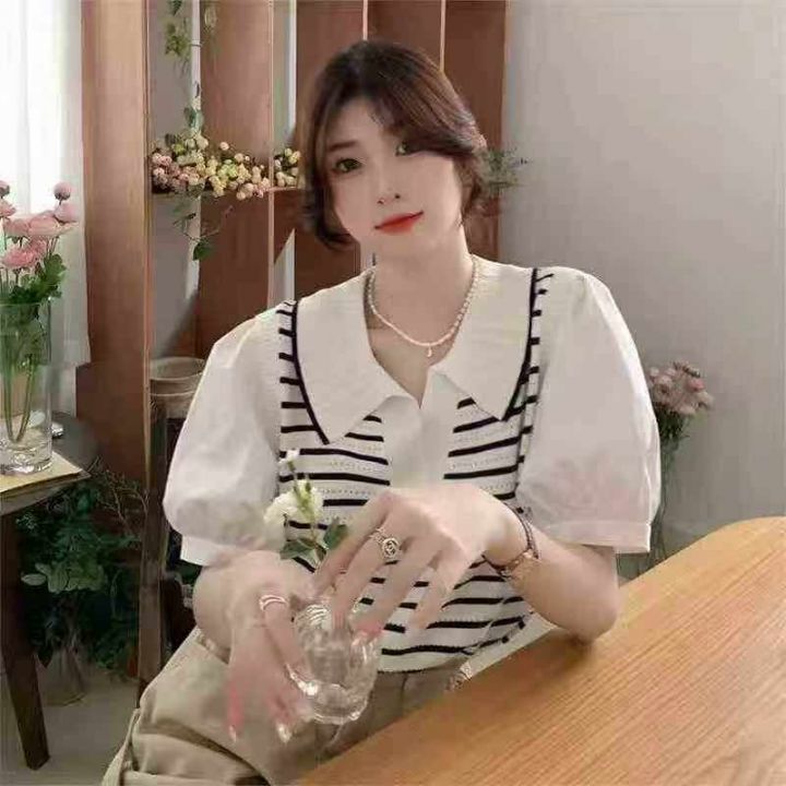 夏季新款冰丝条纹Polo领假两件雪纺拼接袖针织短袖T桖,独立包装,均码面料...