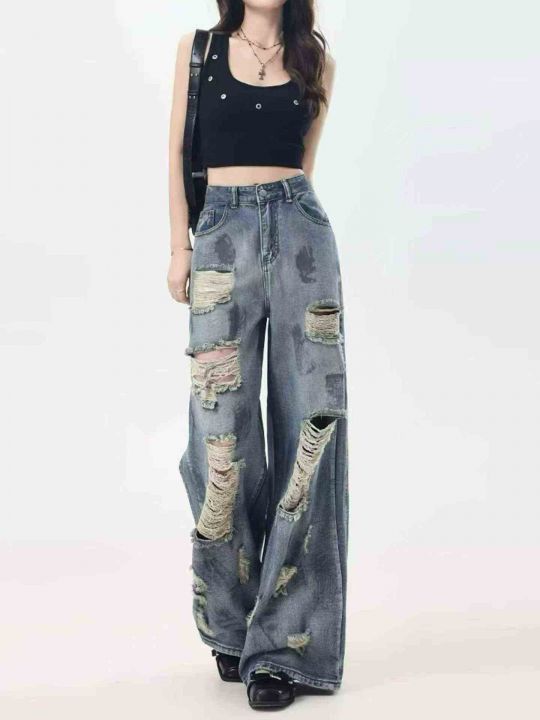 复古扎染废土风破洞女牛仔裤水洗垂感阔腿拖地裤,码数S-XXL,面料舒服柔软...
