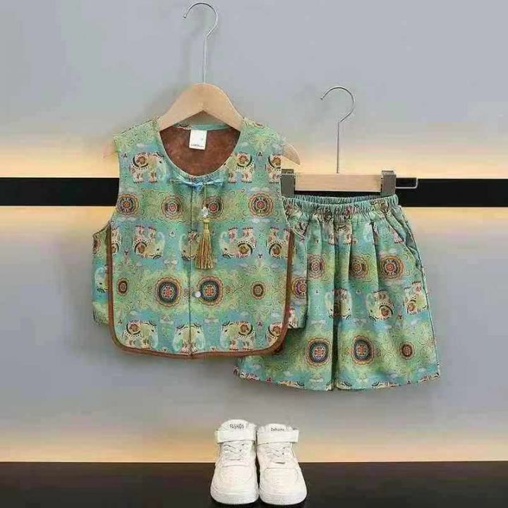 全清价7.8男女童夏季时尚汉服套装洋气中式国风背心短裤两件套,配送流苏,...