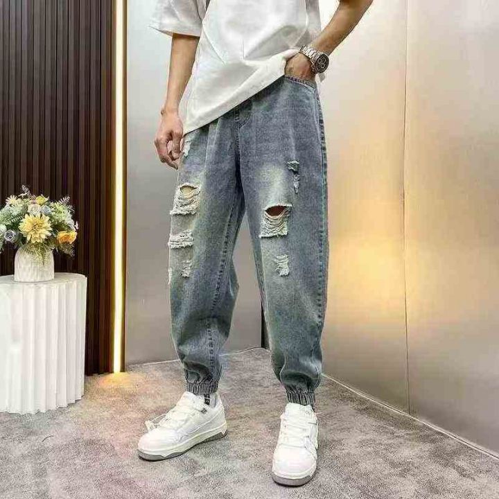 男士破洞牛仔裤2025新款宽松束脚百搭哈伦潮裤100件,独立包装带吊牌,尺码M...