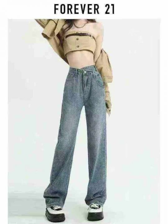 ☕️63033# 美式拼接毛边阔腿牛仔裤女秋季新款高腰宽松显瘦直筒长裤 350条...