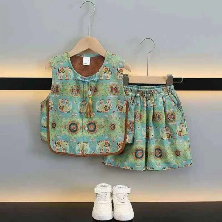 全清价7.8男女童夏季时尚汉服套装洋气中式国风背心短裤两件套,配送流苏,...