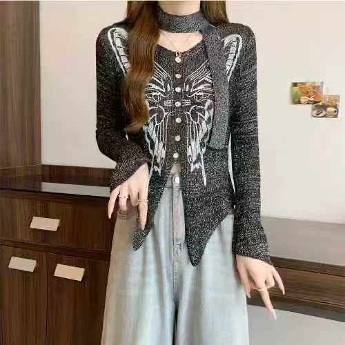 秋季新品爆款美拉德色系个性独特炸街蝴蝶设计款长袖针织衫,独立包装,均码...