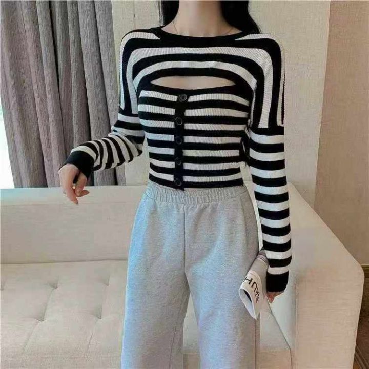 秋季新款撞色条纹软糯吊带背心+针织弹力修身上衣俩件套套装,独立包装,均...