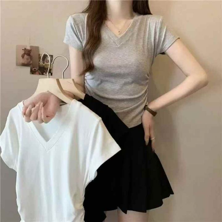 上新全清:6.8一件韩版v领纯色正肩褶皱收腰设计感辣妹T恤,[爱心]195件左右...