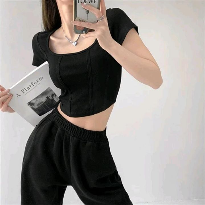 夏季新款辣妹纯欲鱼骨u领正肩弹力修身短袖T桖,独立包装,2款多色,码数S-L...