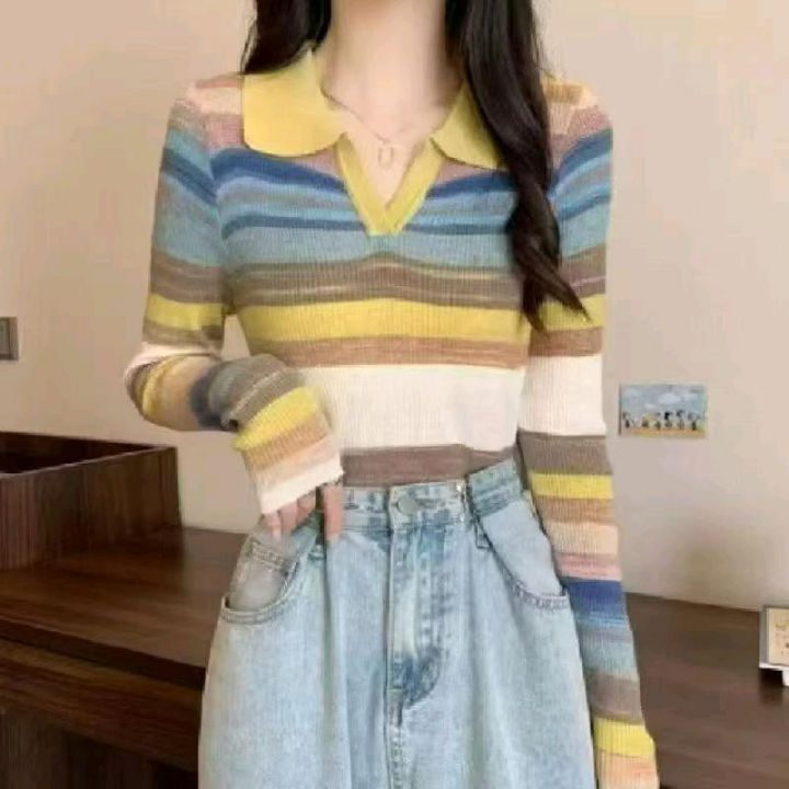 秋季新款POLO领撞色彩虹条纹微胖MM设计感时尚宽松长袖套头毛衣羊毛衫,独立...