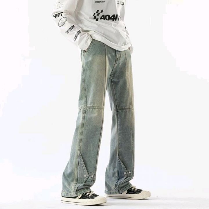 春季新款网红复古男士洗水棉美式高街排扣设计感直筒微喇牛仔长裤,独立包装...