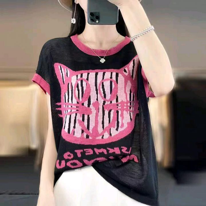 夏季新款时尚设计感拼色猫咪提花宽松慵懒风显瘦落肩针织小衫,独立包装,均...