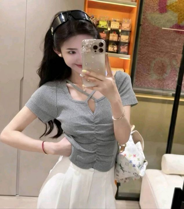 夏季新韩版版百搭弹力修身半开领小心机短袖针织T桖,独立包装,均码面料柔...