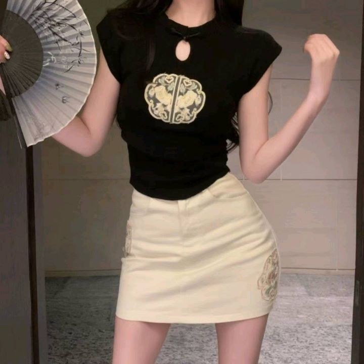 夏季新款复古新中式盘扣国风刺绣设计感百搭针织小衫,独立包装,均码面料柔...